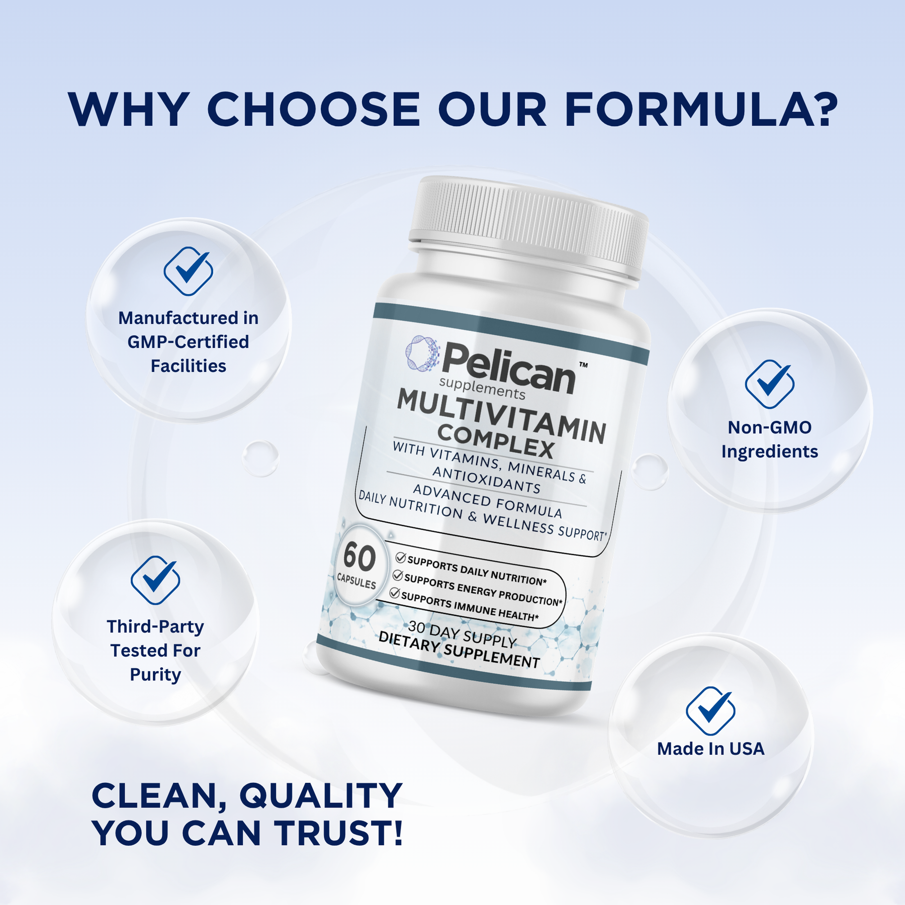 Multivitamin Complex is formulated with essential vitamins, minerals, antioxidants, and herbal blends to support daily nutrition, energy production, and immune health. This advanced formula is designed to help bridge nutritional gaps and support overall wellness in a convenient daily supplement.